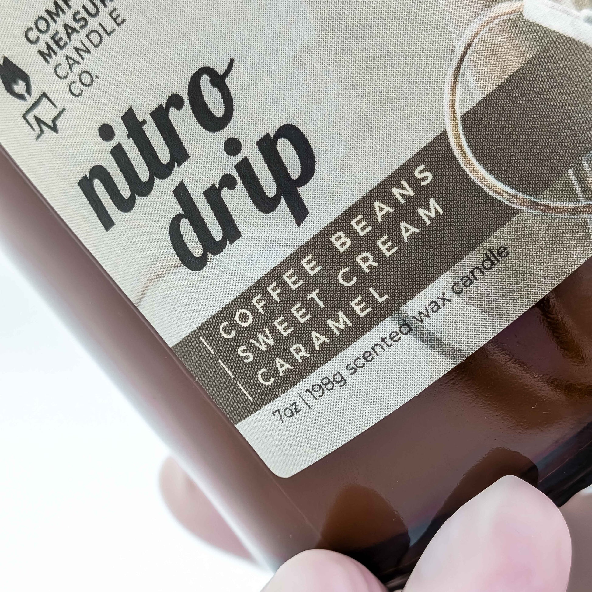 The candle label "nitro drip" refers to an intravenous infusion of nitroglycerin that may be administered to treat chest pain or pulmonary edema. Off label, it can be used to treat chest pain secondary to stimulant use. Coincidentally, many coffee chains brew a style of coffee that is infused with nitrogen and call it "nitro cold brew" which is how this scent got it's name.